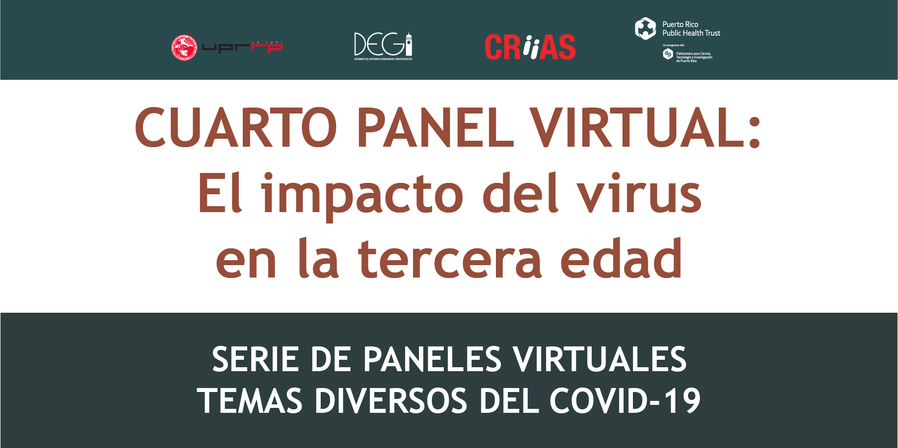 El Centro de Investigación Interdisciplinaria y Aprendizaje Subgraduado (CRiiAS)), adscrito al Decanato de Estudios Graduados e Investigación (DEGI) de la Universidad de Puerto Rico, Recinto de Río Piedras, les exhorta a participar del 4to Panel Virtual dedicado al tema sobre COVID-19: El impacto del virus en la tercera edad.
