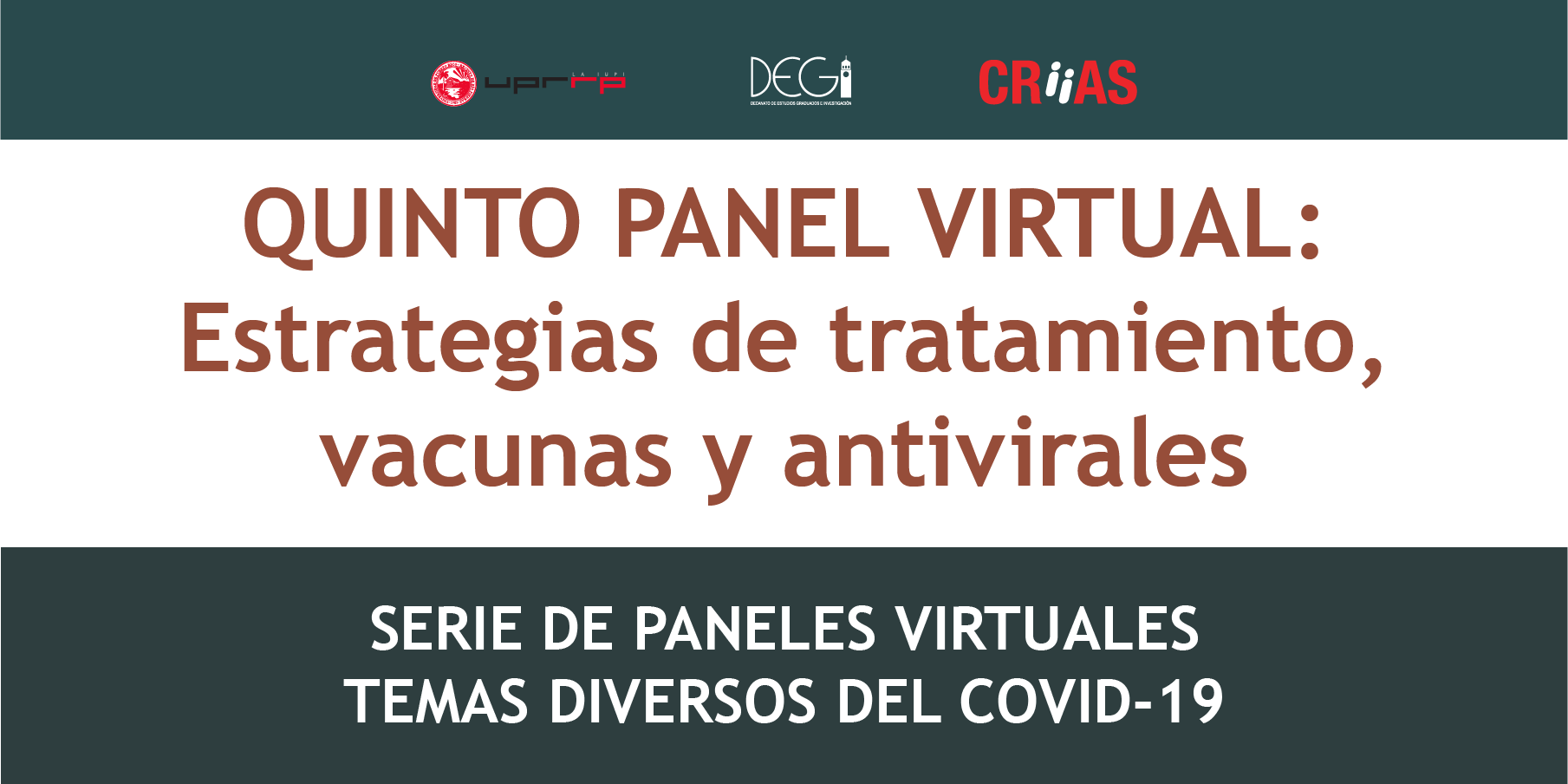 El Centro de Investigación Interdisciplinaria y Aprendizaje Subgraduado (CRiiAS), adscrito al Decanato de Estudios Graduados e Investigación (DEGI) de la Universidad de Puerto Rico, Recinto de Río Piedras, les exhorta a participar del 5to Panel Virtual del COVID-19: Estrategias de tratamiento, vacunas y antivirales.